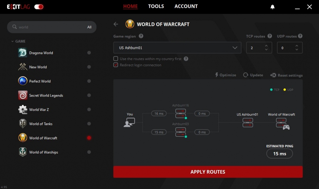 Az ExitLag nem egy klasszikus értelemben vett VPN szolgáltató,  de VPN-hez hasonló működési elven alapszik. A program automatikusan felismeri, ha elkezdesz játszani és ennek megfelelően működésbe is lép. Több fronton is beveti tudását: optimalizálja a kiküldött csomagjainkat, de közben (itt jön képbe a VPN) próbálja ezt a legjobb elérhető útvonalon megtenni. Így ha a szolgáltatónk által használt routing szerverek nagy terhelés alatt vannak és emiatt a packet loss / ping értékünk sem a legjobb, akkor a program kiváló megoldást nyújthat a problémára. Rengeteg játékot támogat, csak, hogy a nevesebbeket említsük: