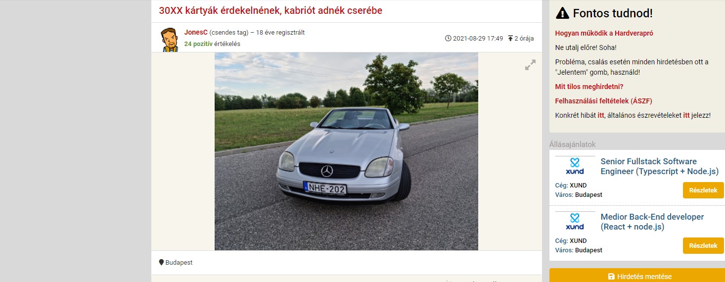 „30XX kártyák érdekelnének, kabriót adnék cserébe” – írja egy friss hirdető a Hardveraprón.