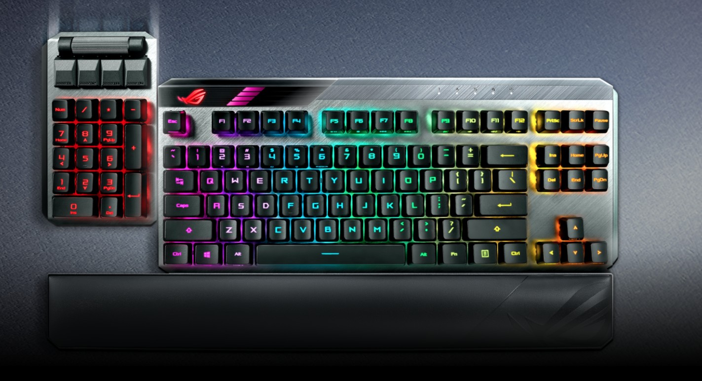A nagy népszerűségnek örvendő ROG Claymore utódja, ami immáron optomechanikus kapcsolókkal rendelkezik. A dizájn még letisztultabb, viszont a moduláris (magyar!) kivitelnek hála a NumPadot továbbra is kedvünk szerint pakolgathatjuk. A vezetékeknek is búcsút mondhatunk, ugyanis az Asus ROG Claymore II-t immáron a 2,4 GHz-es rádiófrekvencián érhetjük el, az energiáról pedig egy 4000 mAh-s akkumulátor gondoskodik.