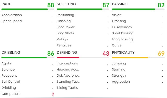 A FUT 21-es 87-es lapjához képest a következőkben már egy 89-es Rating-el állhatunk neki a Premier League csapat építésének. Értékei szempontjából elenyésző a különbség, van, ami maradt (88 Pace, 43 Defending, 69 Physicality), van, ami nőtt (Shooting 86/87, Passing 80/82) és bizony akad olyan is, ami sajnos csökkent, igaz, nem nagy mértékben (Dribbling 87/86). Ebből kiindulva, alapvetően nem valószínű, hogy nagy mértékű változás történhet az irányításában és játékában, mert ez a különbség abszolút minimális. Egy megbízható és stabil lapnak ígérkezik a játék első szakaszában, bárkinek is áll szándékában angol 1. osztályú csapatot összerakni.