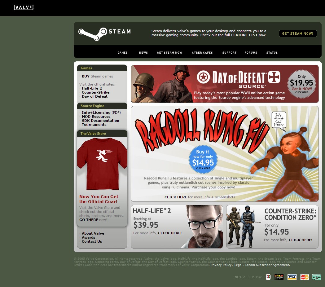 Amikor a Half Life bizonyította a platform létjogosultságát, a Valve elkezdett dolgozni a már évek óta vizionált digitális áruházon. Erre egészen 2005-ig kellett várni, ekkor jelentek meg ugyanis a Steamen az első nem Valve fejlesztette játékok, a Ragdoll Kung Fu és a Darwinia.