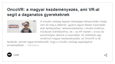 A HVG számolt be róla, hogy az Onco VR-t már a Bethesda Gyermekkórház égési és sebészeti osztályán is használják, leginkább a sérült gyermekek kötéseinek cserélésekor. Ilyenkor egy VR-ban nézhető mesefilmet vetítenek nekik, ami eltereli a figyelmüket a kötéscsere okozta fájdalmakról, ami nagyban hozzájárul ahhoz, hogy kevesebb gyógyszert kelljen beadni nekik.