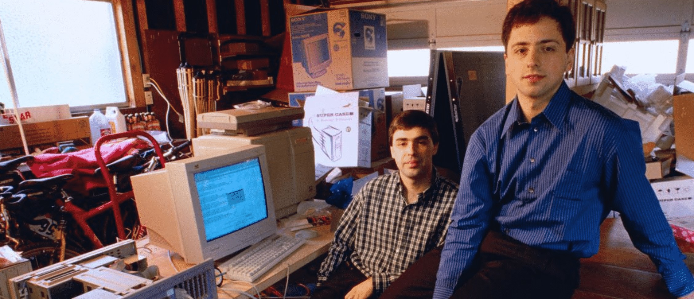 Larry Page és Sergey Brin a Google első főhadiszállásán, egy barátjuk garázsában