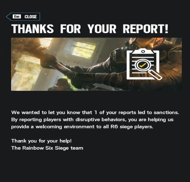 Természetesen a Rainbow Six: Siege-ben is gondot jelentenek a csalók, ám talán jó hír, hogy a Ubisoft tényleg mindent megtesz annak érdekében, hogy ne sokszor találkozzunk velük. Az egyik, ami bizonyítja a csalók elleni küzdelmet, az az, hogy a játék közben a képernyő jobb felső sarkában láthatjuk, hogy néha kiket bannolnak és miért. A másik módszer a különböző játékosok által jelentett fiókok figyelése és kitiltása. A játékosok pedig miután reportoltak valakit, általában értesítést kapnak arról, hogy a report célba ért, és bannolták a csalót.