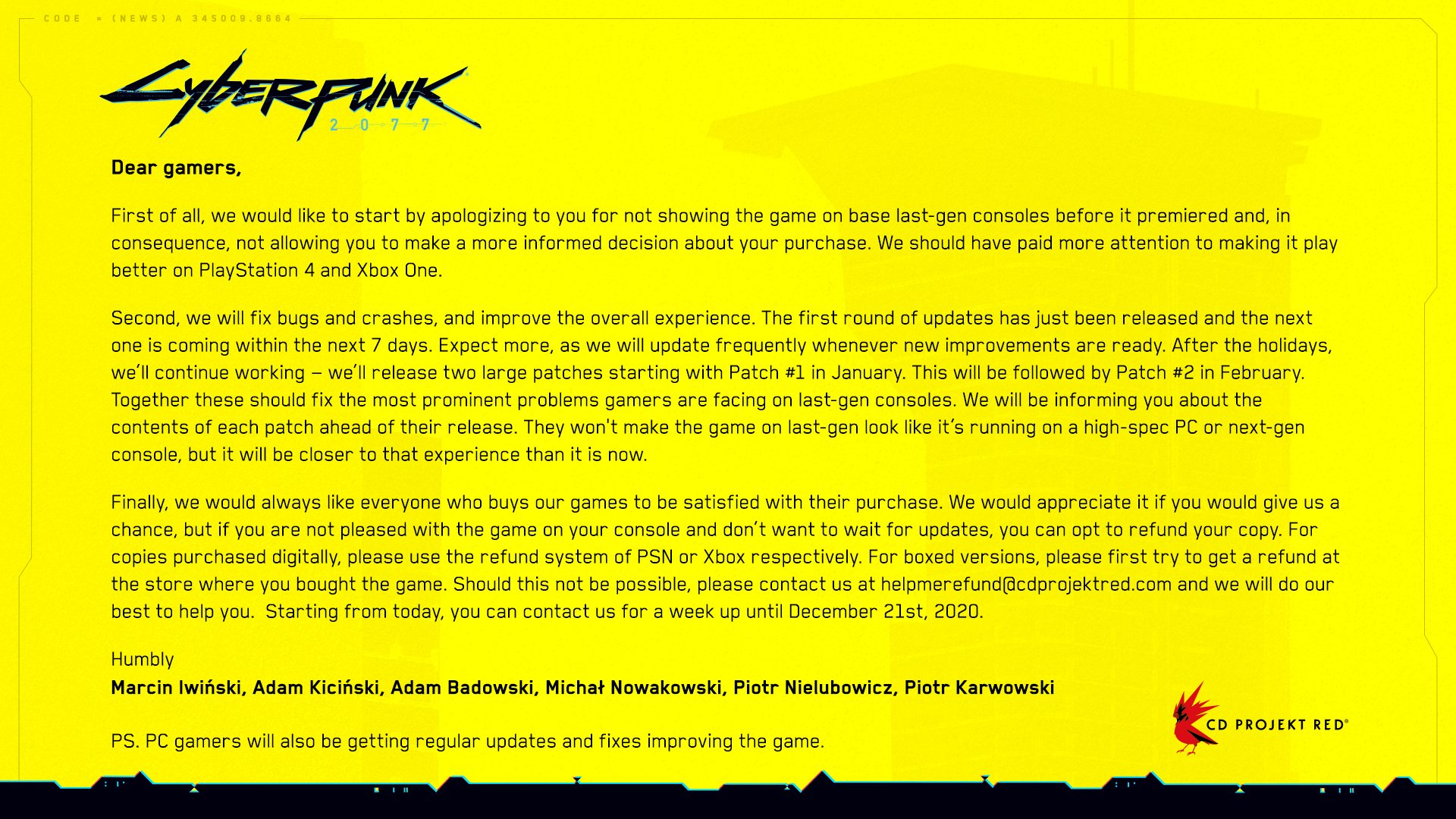 Ez egy igen szimpatikus hozzáállás a játék rettentően döcögős indulása után. Ha emlékeztek még, a CD Projekt Red egy nyilvános bocsánatkérést is közzétett a játék megjelenése után, miután hibák és összeomlások övezték azt.