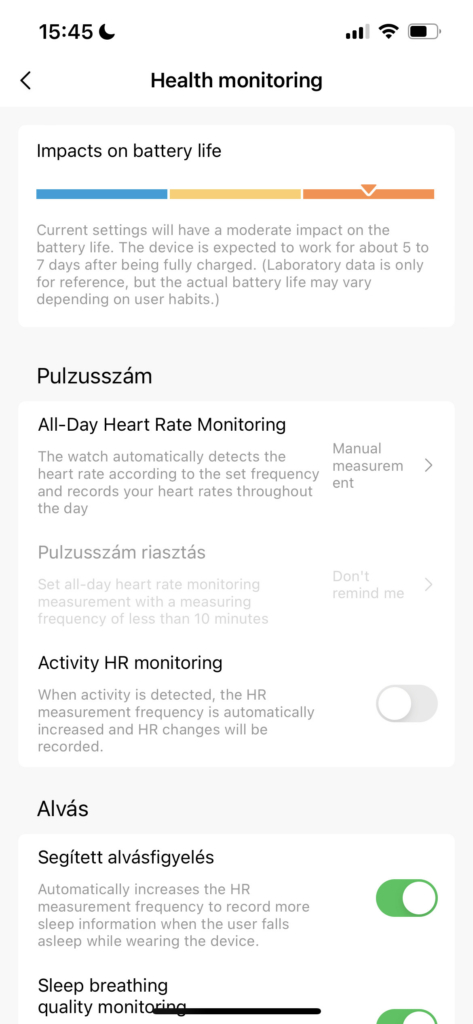 A Mi Fit nem is olyan rég bővült azzal a funkcióval, hogy a beállítások akkumulátorra tett hatását is kijelzi már a szoftverben. Így tökéletesen látható, hogy mennyi készenléti időre számíthatunk az egyes funkciók be vagy épp kikapcsolása után. A tapasztalatok alapján ezt tűpontosan hozza is.