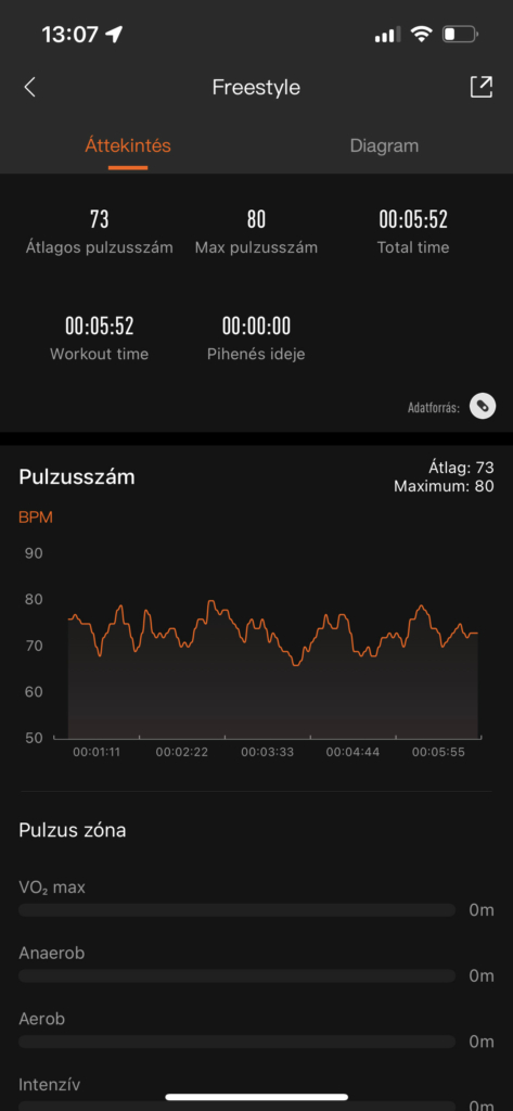 Az edzés nézet is kiváló. Egyszerű, de szépen kinéző grafikonon nézhetjük végig az edzés alatti pulzusszámunkat, az időtartamát és az összes lényegi információt.