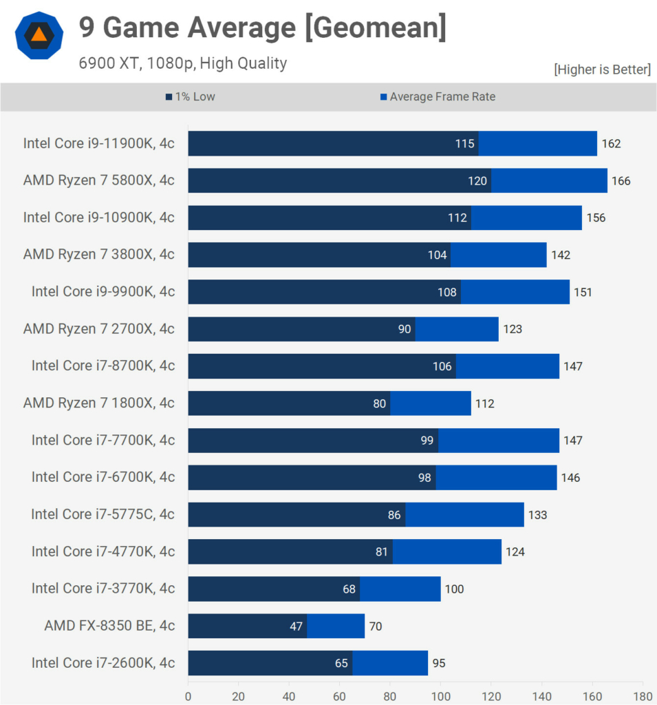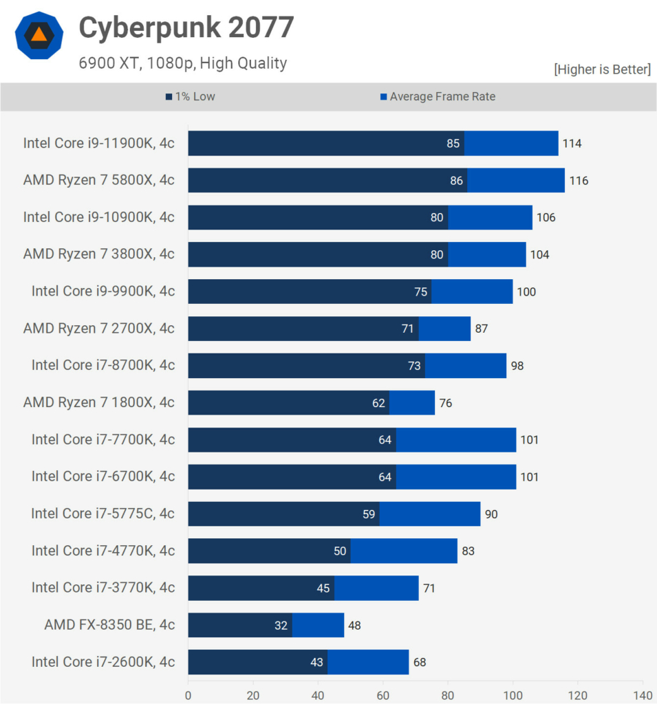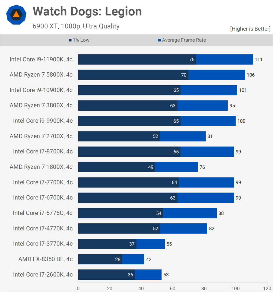 Ne feledjétek, a 8-10 magos szörnyeket is lekorlátozták 4 magra és a processzorok azonos órajelen működtek a teszt során, így gyakorlatilag a nyers IPC fejlődést láthatjuk majd a grafikonokon. Mindezt egy 6900 XT társaságában tették, így egyértelműen nem szólt bele a mérésekbe a videókártya, hiszen vígan kihajtotta ezeket a processzorokat 1080p felbontásban.