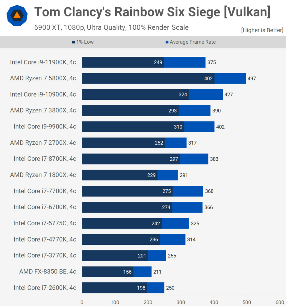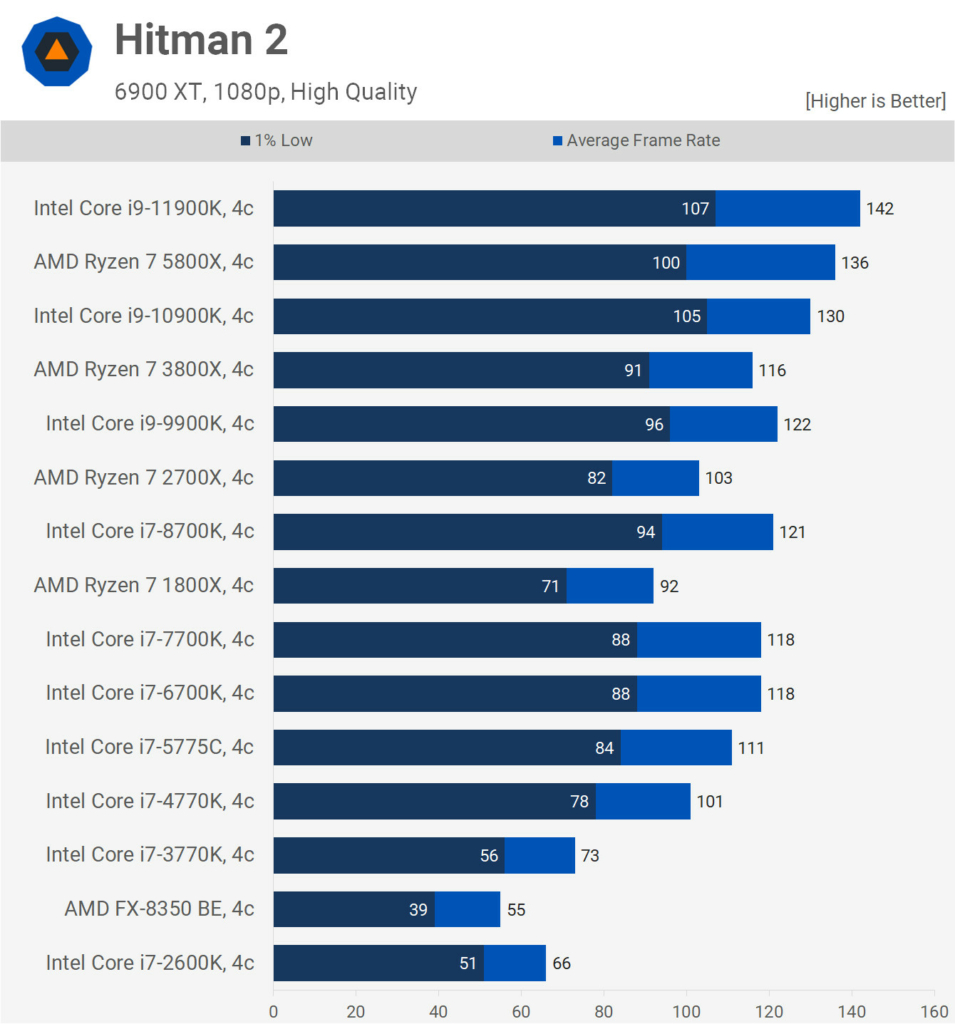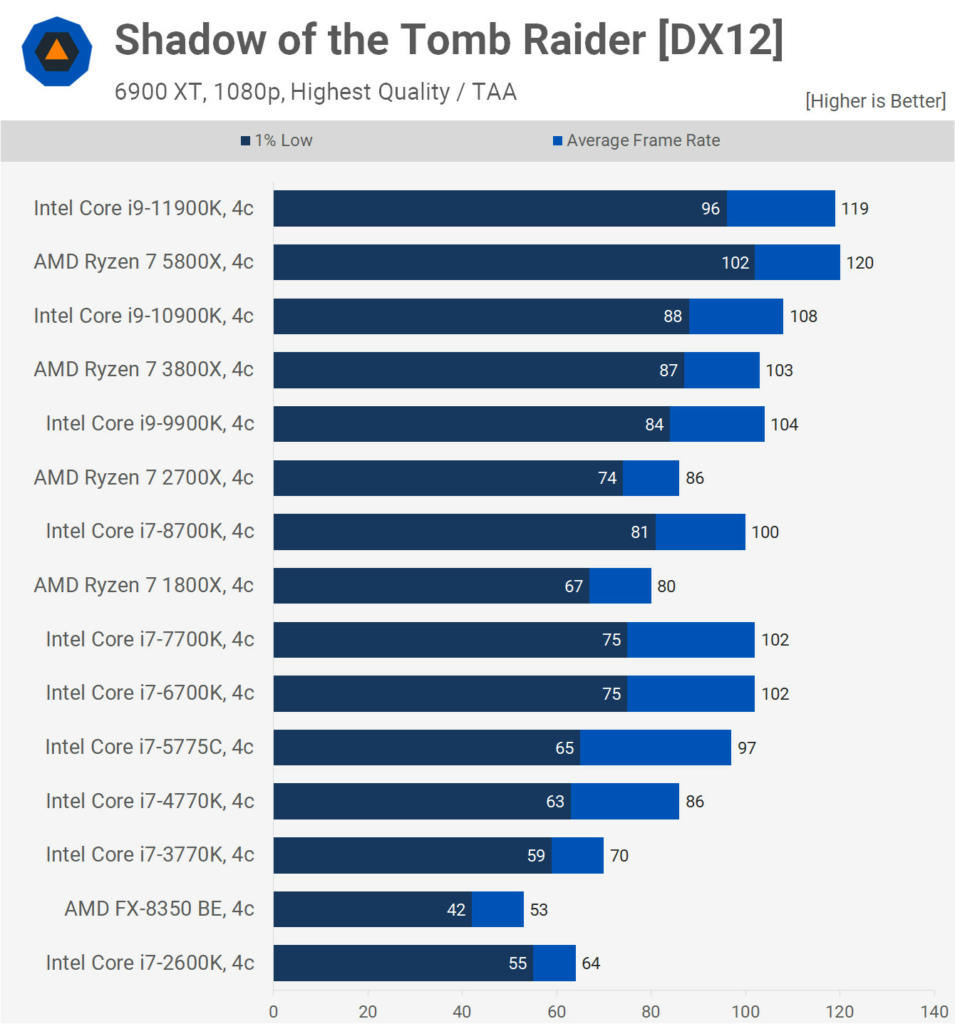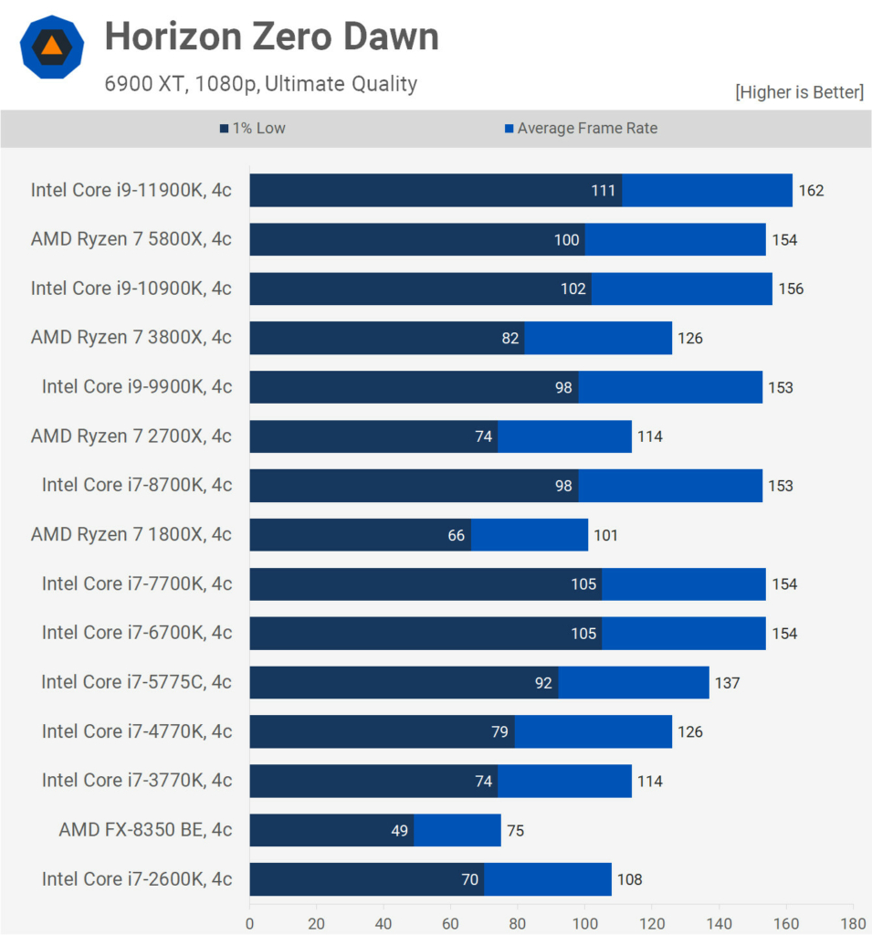 Ne feledjétek, a 8-10 magos szörnyeket is lekorlátozták 4 magra és a processzorok azonos órajelen működtek a teszt során, így gyakorlatilag a nyers IPC fejlődést láthatjuk majd a grafikonokon. Mindezt egy 6900 XT társaságában tették, így egyértelműen nem szólt bele a mérésekbe a videókártya, hiszen vígan kihajtotta ezeket a processzorokat 1080p felbontásban.