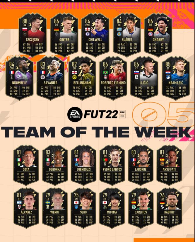 A csapatba érkezett egy új Szczesny Gnabry, valamint Ndombele is. Roberto Firminoban szinte biztosak voltunk hiszen a brazil triplázni tudott a hétvégén. A Featured TOTW lapot Suárez kapta, aki Ansu Fatit és Guendouzit szorította ki a sorból.  Hát ez a hét nem igazán sikerült nívósra. Én a hétvégi TOTW pakkomat megtartom, mert ezek a választások annyira nem nyűgöztek le. De kapuban legalább tudok erősíteni.