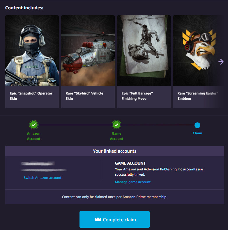 A csomagok aktiválásához csak el kell látogatnunk a Twitch Prime és Call of Duty közös oldalára, majd bejelentkeznünk a „Sign in” gombra kattintva. A „Claim Now”-ra kattintva összeköthetjük Twitch és Activision fiókunkat, ha ezt eddig még nem tettük volna meg. Ezután már csak annyi a dolgunk, hogy az adott csomag „Claim Now” felületén rákattintsunk a Complete claim gombra.