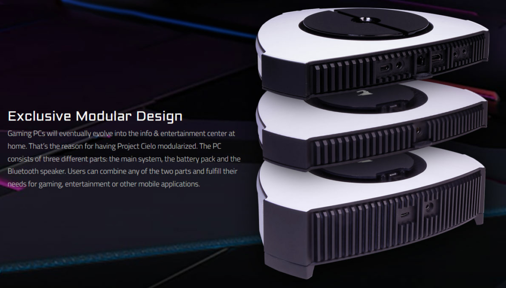 Pontos specifikációt nem ismerhetünk még, így a képekre kell hagyatkoznunk. A fenti képen egy olyan felépítést láthatunk, amely teljes mértékben hordozható és akár áramforrás nélküli helyeken is megállja a helyét. Hiszen a fő rendszert (GPU,CPU, memória, háttértárak stb.) tartalmazó egység mellett találunk egy akkumulátort tartalmazó kiegészítőt és egy másikat, amely akár bluetooth hangszóróként is képes működni.