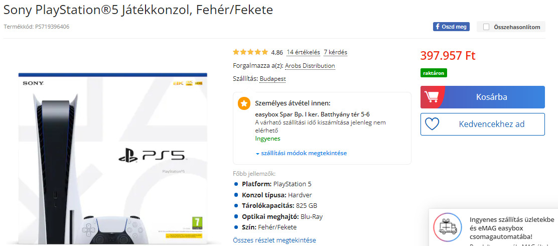 Az eMAG felületén ugyanis nem kevesebbért, mint 397.957 forintért kínálják az egyébként 185.000 forintos PS5-öt.
