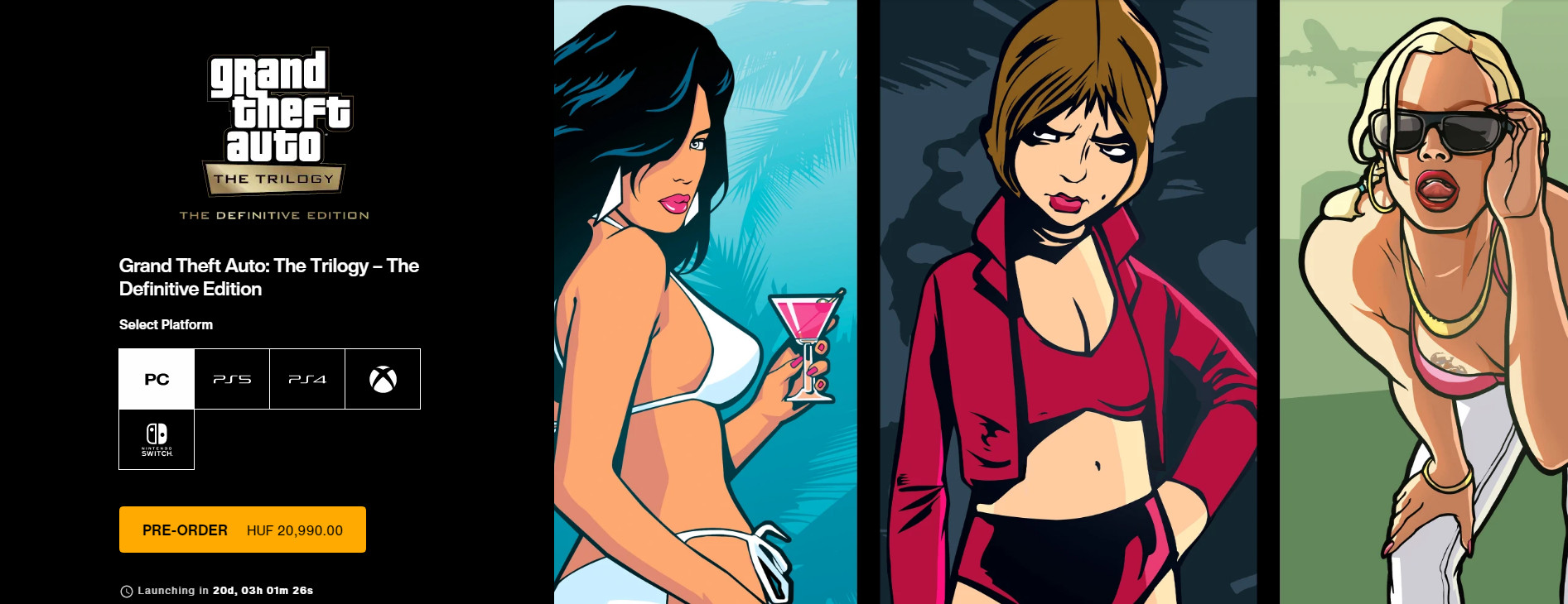 Amint az a Rockstar hivatalos online boltjában látható, a Grand Theft Auto III, a Grand Theft Auto: San Andreas és a Grand Theft Auto: Vice City együtt 20990 forintba kerül. Miközben a játék(ok) november 11-én lesznek játszhatók, ha 2022. január 5. előtt megvásárolod a csomagot a hivatalos Rockstar Store-ból, jogosult vagy egy 10 dolláros kedvezményre egy másik, a boltban található játék árából, ami legalább 15 dollárba kerül.