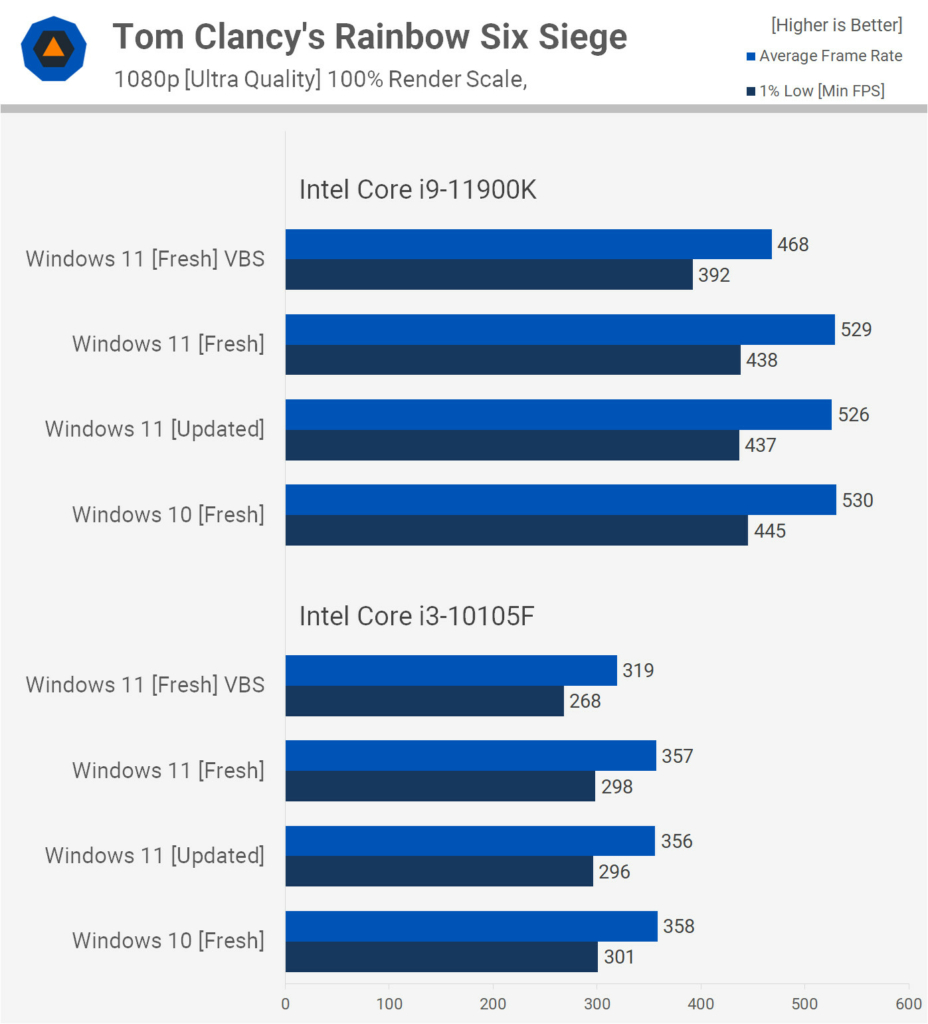 Ahogy láthatjuk, itt kicsit változatosabb az összkép. A VBS itt is rondított az FPS számokon, de például a F1 2021 alatt nem volt mérhető különbség, ellenben a Rainbow Six Siege nagyon is megérezte már.
