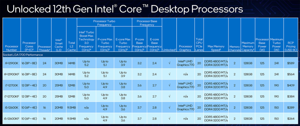 Jelenleg az i9-12900K(F), i7-12700K(F) és i5-12600K(F) processzorokat leplezték le, ahogy arra számítani is lehetett. Az F jelű változatokban ismét hiányozni fog az iGPU, míg a sima K jelűeknél egy Intel UHD Graphics 770 fog dolgozni majd. A processzorok egyaránt támogatják a DDR4 és DDR5 memóriamodulokat is, az adott alaplaptól függ, hogy milyet kell majd a gépünkbe pattintani. A kis- és nagymagok különböző órajelen ketyegnek majd. Öröm, hogy az Intel ezúttal a szokásos „kamu” TDP mellett egy Maximum Turbo Power oszlopban a valós fogyasztást is felvázolta, az i9 processzorok akár 241 wattot is megehetnek a dobozra írta 125 helyett.