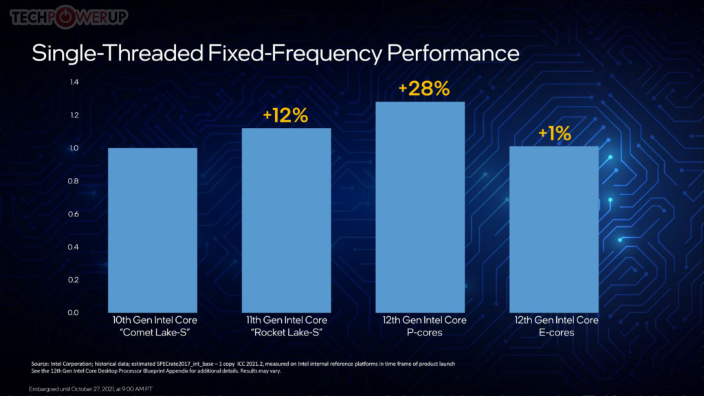 Jól látható, hogy az Intel 10. generációs processzorainak teljesítménye volt az alap, nem pedig a 11. generációé. Ezért kicsit csalókák lehetnek a növekedések. A P magok 28%-kal lesznek gyorsabbak azonos órajelen, mint a 10. generáció, míg az E magok 1%-kal lesznek gyorsabbak. Így igazából kijelenthetjük, hogy az energiatakarékos feladatokra szánt magok is meglepően erősek lesznek, a 10. generáció szintjét hozzák.