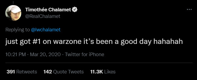 Chalamet rengeteg játékcímmel játszott már, például a Luigi’s Mansion és a Super Smash Bros. Több Call of Duty-címet is birtokol, játszott a Call of Duty: Modern Warfare 1-gyel és a Call of Duty: Modern Warfare 2-vel is. Látszott rajta, hogy teljesen beleélte magát a beszélgetésbe, amikor a Modern Warfare 2-es emlékeiről mesélt. Chalamet még a Dűne-film forgatásán is kockult Oscar Isaac-el, aki egy PlayStation 4-et hozott a lakókocsijában.