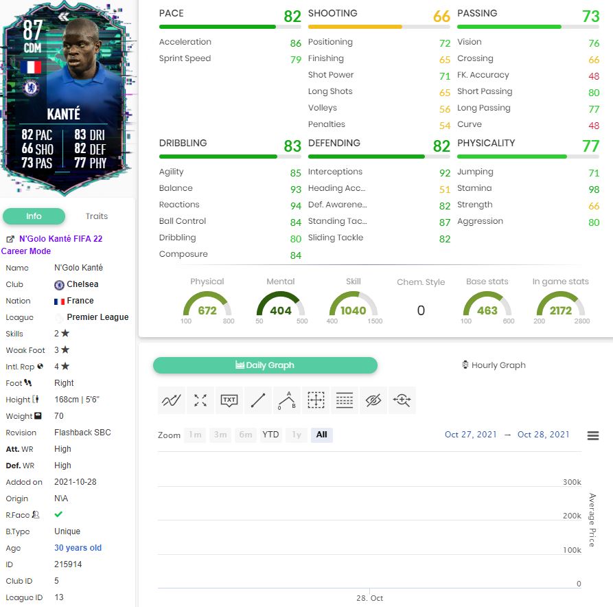 Az új lap gyorsabb és jobb dribblinget kapott, míg védekezésben és erőben, valamint agresszióban gyengébb. Ami még nagy különbség, hogy a gold lapnak High-Medium WR-rel, míg a Flashback Kanté High-High Work Rate-tel rendelkezik. Köszönhetően az SBC-nek az arany lap ára 100 ezer zsetonnal esett tegnap óta így boxon az SBC árához közeli értéken elhozhatjuk.