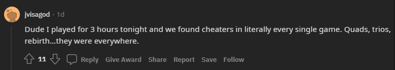 Persze nem volt egyedül a bejegyzés készítője. „Ma este 3 órát játszottam, és szó szerint minden egyes játékban találtunk csalókat. Quad, Trio, Rebirth… mindenhol ott voltak” – mondta egy másik Redditor.