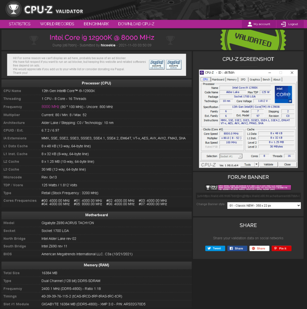 Bizony, nem írtuk el. HiCookie-nak sikerült megugrani azt a lépcsőfokot, amit sem a 10. , sem a 11. generációnál nem sikerült senkinek. Kis csavar a dologban, hogy csak az egyik magot hajtotta ezen az órajelen, a többi 4000 MHz környékén pihent.