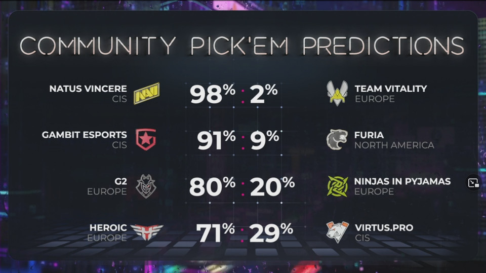 A Pick Em játékosok szerint a G2 és a HEROIC továbbjutása is egyértelmű volt, mind a kettő tényleg be is következett. A másik két meccsre Na’Vi illetve Gambit sikert jósolnak a látnoki nézők, ráadásul még durvább százalékokkal. 98% és 91%, a korábbi 80% és 71% helyett.