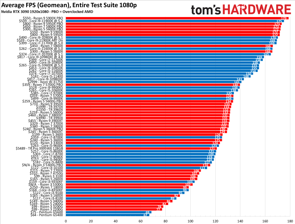 Természetesen a többi processzorról sem feledkeztek meg a Tomshardware szakemberei. A Ryzen 9 5900X-től kezdődően egészen a Pentium G5400-at megtaláljuk majd a lenti táblázatban. Az összehasonlítás alapja itt is az átlag FPS érték, a videókártya pedig egy RTX 3090 volt, hogy biztosan ne limitálják az egyes processzorok erejét. Ebben még nem szerepelnek az új, Alder Lake Intel processzorok, de azok teljesítményét már az első képen leolvashattuk. Nézzük is hogyan teljesítenek a többiek: