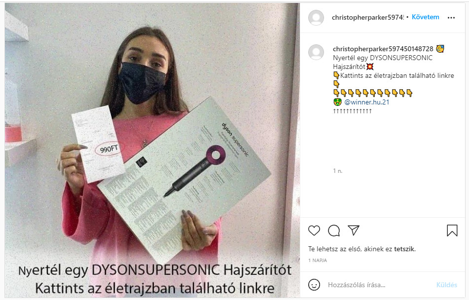A múlt heti OTP-s csalás után itt a következő, amiben egy 150.000 forintos hajszárítót használnak csaliként Instagramon. Semmiképp se dőljünk be neki, szóljunk a nagymamának is!