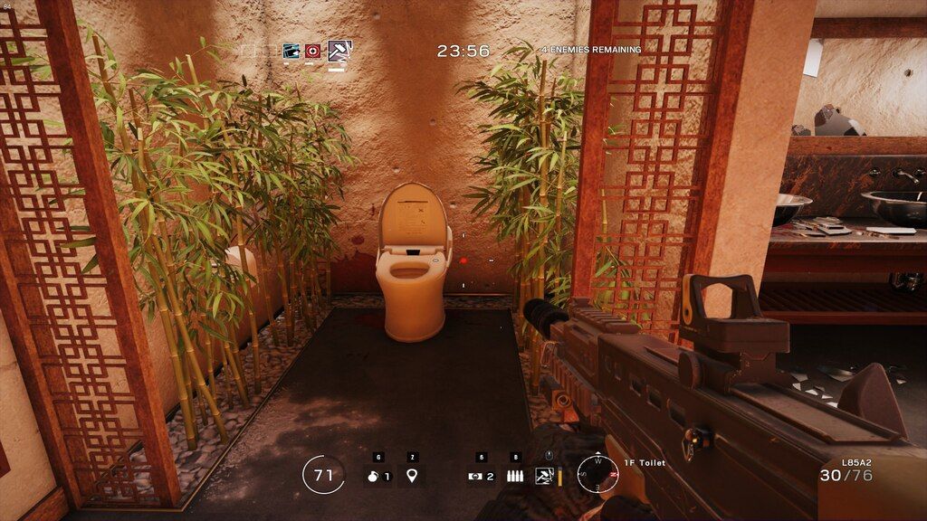 Semmi kétségem nincs afelől, hogy a Rainbow Six: Siege pályáit alaposan kidolgozták. Vannak terek, szobák, a helyszíneknek megfelelő stílusok és sajátosságok, és persze mindenféle részletes tereptárgy, ami szét lehet lőni, robbantani. Persze a pályákon mellékhelyiség is található, így az operátorok akár ki is mehetnek, ha éppen hívja őket a szükség. Szóval most egy játékos szépen kiszámolta, hogy