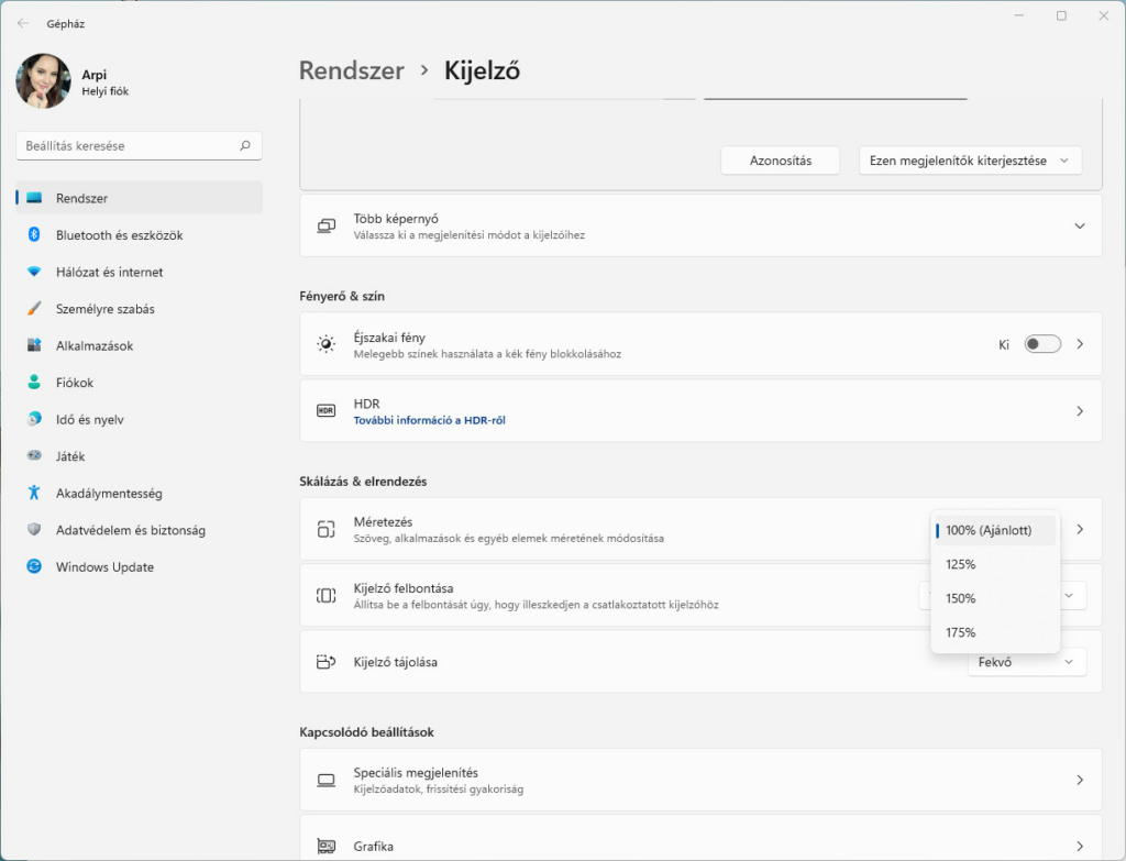 A Windows lehetőséget ad az ablakok és UI elemek Scaling/DPI méretezésére. Ez főképp kisebb méretű, de nagy felbontású kijelzőknél szokás bekapcsolni, hiszen enélkül nagyon aprók lennének a megjelenített információk. Ez sem tökéletes Windows 11-ben, van, hogy még monitoronként is eltérő Scaling értékekkel jeleníti meg az ablakokat az operációs rendszer.