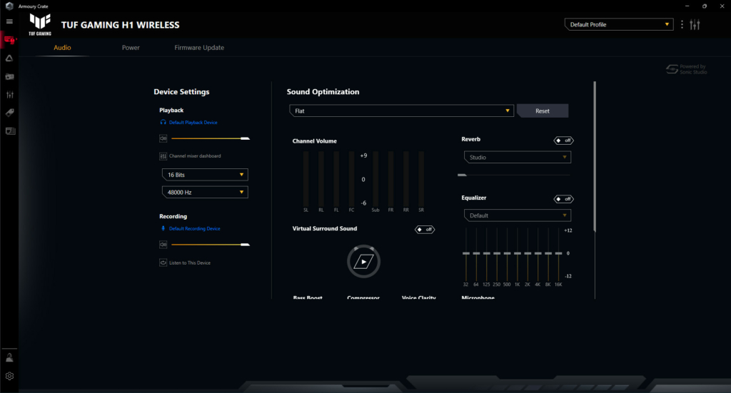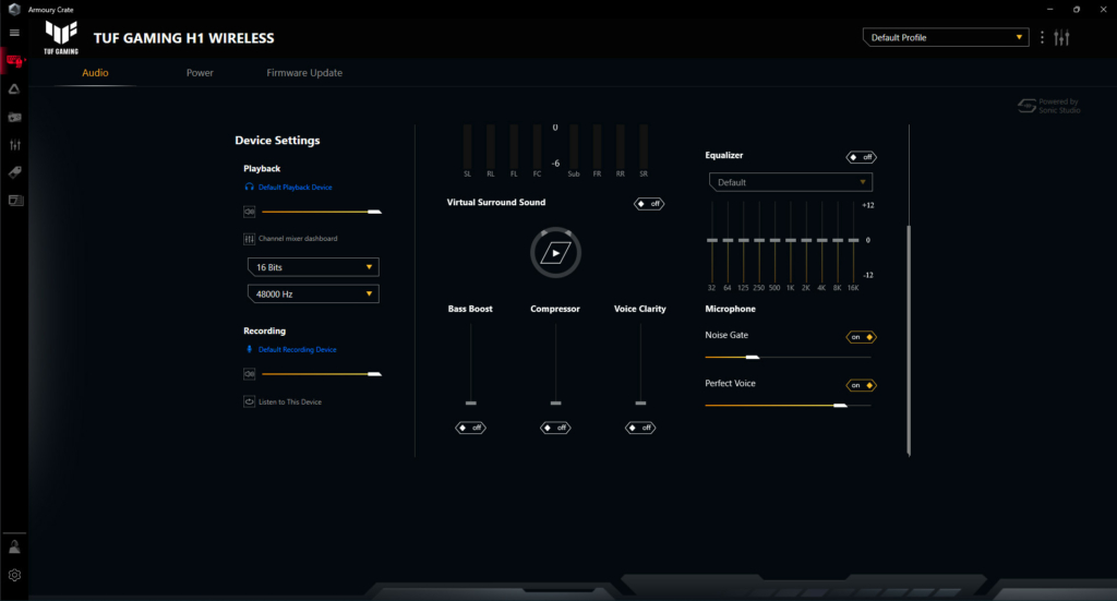 Szerencsére itt sem spórolt semmit a gyártó, a ROG Armory Crate segítségével még jobban személyre szabhatjuk a fejhallgató beállításait. Állíthatunk manuális EQ-t, de a cég által előre definiált felhasználási módokat is kipróbálhatjuk. Itt kapcsolhatjuk ki/be a virtuális 7.1 hangzást, illetve itt babrálhatunk a mikrofon beállításaival is. Ezen a felületen tájékozódhatunk az akkumulátor töltöttségi szintjéről is, ám ezt később a tálcán is megtehetjük a program ikonjára kattintva, nem kell mindig megnyitni a teljes szoftvert. A fejhallgató bedugását követően egy felugró ablak el is lát minket egy linkkel a szoftverhez, ezért jár a piros pont.