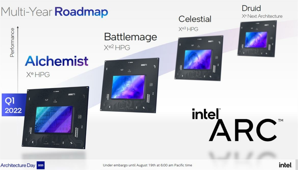 Az Intel az NVIDIA-tól és az AMD-től eltérően 2021-ben 4 generációra előre prezentálta a készülő videókártyáit. Az első széria Alchemist névre hallgat majd és 2022-ben már a boltok polcaira érkezhet. A legerősebb tagját 3070 szinte várják a felhasználók az iparági pletykák alapján, de hivatalos benchmarkok híján ez csak feltételezés. Az Intel a kártyák árával robbanthat igazán nagyot, hiszen ha több tízezer forinttal a riválisok alá tud vágni, akkor kezdhetik nyitni azt a bizonyos széfet.