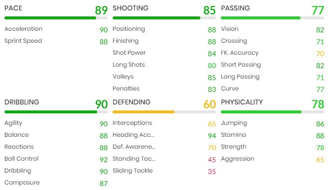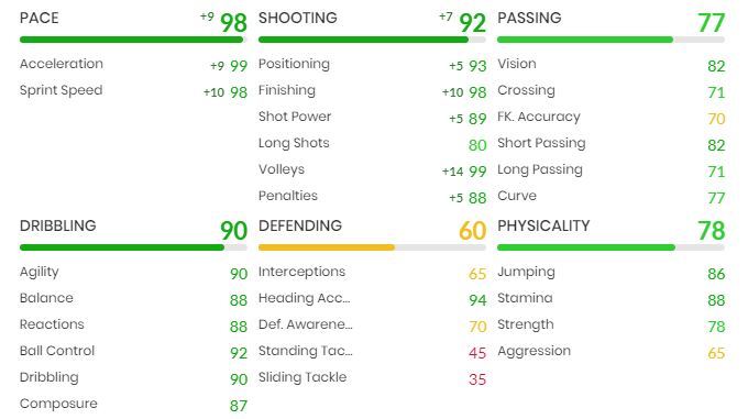Elsőre kicsit soknak hangozhat egy 86-os lapért, viszont ha a statisztikáit megnézzük, alapvetően nem rossz lapról van szó, sőt, 4* Skill Moves, 4* Weak Foot, valamint Benzema lap létére meglehetősen gyors a 89-es Pace értékkel, remek Positioning és Finishing társult a laphoz, valamint jár hozzá 90-es Agility és 88-as Balance is. Viszont, hogy halmozzuk az élvezeteket, hozzáadtuk a statisztikákhoz a kártyához egyik leggyakrabban használt Chemistry Style-t, a Hunter-t. Nos, az eredmények magukért beszélnek: