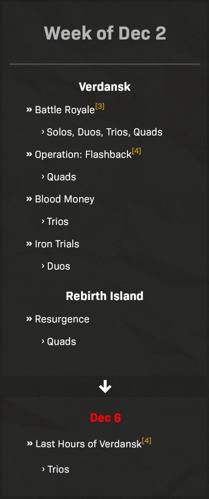 Értelemszerűen az Operation: Flashbacket megtartották a fejlesztők, az már nem fog kiesni Verdansk pusztulásáig. December 6-án este várhatunk még egy kisebb változást, a fenti kép szerint ekkor érkezik a Last Hours of Verdansk játékmód, mellyel elbúcsúztathatjuk a régi helyszínt és átszellemülhetünk az új, Caldera névre hallgató pályára. Élvezzétek ki az utolsó pár napot, már nem kell sokat aludnunk a Warzone Pacific érkezésééig.