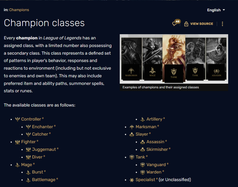 Ezek gyakran a szokásos fantasy trópusok, mint a Fighter, a Healer és a Mage. Bár a LoL egy kicsit más, minden bajnok hasonló szerepekbe esik, mint ezek, egy kis eltéréssel közöttük. Ezek talán átültethetők az új MMO-ra is, ha egyszer megjelenik.
