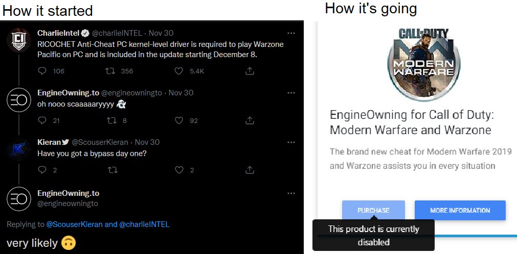 Itt látható, hogy az EngineOwning próbál keménynek tűnni, ám a jobb oldalon látható, hogy jelenleg nem árusítanak csalást. Remélhetőleg ez így is marad, mivel nem tenne jót az Activisionnek az, ha visszatérnének a csalók a rengeteg bug és hiba mellett, ami az új nagy frissítéssel érkezett.