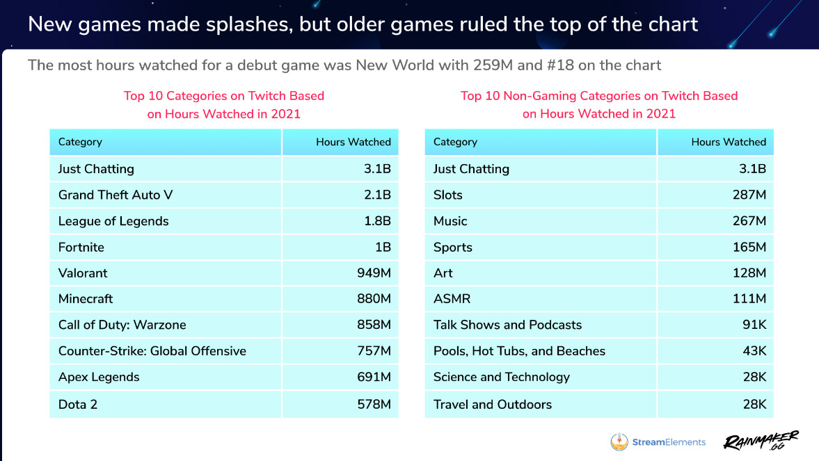 Bár éveken keresztül a League of Legends volt a legnézettebb játék, sőt volt olyan év (2018), amikor a Fortnite, idén már a GTA V vette át a vezetést. A LoL még mindig az egyik legnézettebb játék volt idén, bár nem az első. A többi top játék (nem sorrendben) a Fortnite, a Minecraft, a Call of Duty: Warzone, a CS:GO, a Valorant, a Dota 2 és az Apex Legends volt.