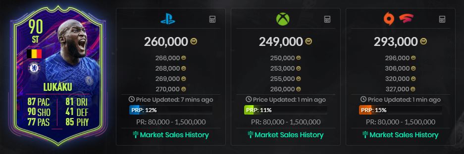 Mivel ebben az árkategóriában más játékos egyszerűen nem szerepelt rajta kívül, így kicsit szélesebb spektrumban néztünk körül, felvittük a maximum árat 300 000 Coin-ig. ebben az esetben Keane-en jívül egyetlen lap volt csak, aki megfelelt a kritériumoknak, az pedig Romelu Lukaku OTW kártyája.