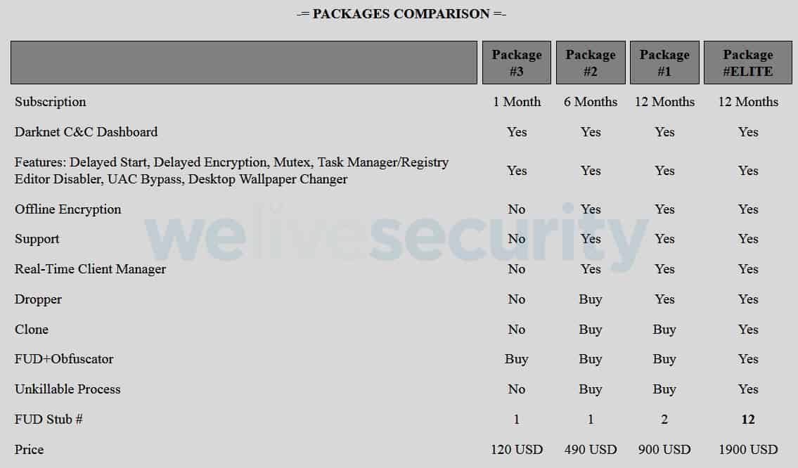 A zsarolóvírusok széles skálája érhető el a dark weben. Ahogy a legális szoftverek esetében, itt is vannak rendszeres frissítések, technikai támogatások. Itt feltüntetik a különböző funkciókat, azok hosszát és sok esetben a részesedésüket is, ami a váltságdíj adott százalékát foglalja magában.
