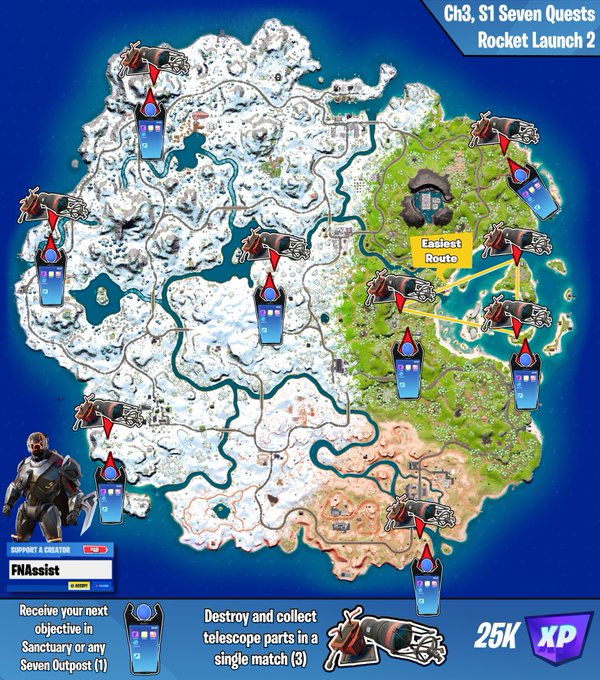 A leakerek már az elmúlt hetekben észrevették, hogy nagy valószínűséggel az egyik Seven rakéta már el is hagyta a Fortnite szigetet. Keddre visszatért, ám úgy tűnik, hogy a játékosok segítsége kell ahhoz, hogy ismét repülni tudjon. A telefonra hajazó ikonokkal azokat a pontokat találod a térképen, melyeken felveheted a küldetést. Ezután meg kell keresnetek a teleszkópokat a szigeten, legalább három darabot. A fenti térképen találsz egy Easiest Route névre hallgató háromszöget, ha jót akarsz magadnak, akkor ezt a gyors útvonalat használod a darabkák összegyűjtésére.