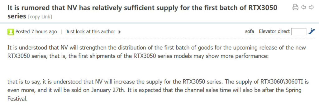 A kínai Board Channels fórumon bukkant fel először a pletyka, hogy a gyártó rendesen betárazott a videókártyákból, így az első szállítmányok az átlagosnál nagyobbak lesznek, több felhasználónak juthat kártya. Két okból teheti ezt meg az Nvidia, egyrészt ott az AMD által bejelentett RX 6500XT, melyre kiváló válasz a 3050. Másrészt pedig rengeteg (fél)hibás 3060 GPU-val rendelkezhettek a külsős partnerek is a gyárakban, így szorgosan gurulhattak le a gyártószalagról az RTX 3050 kártyák az elmúlt időszakban.