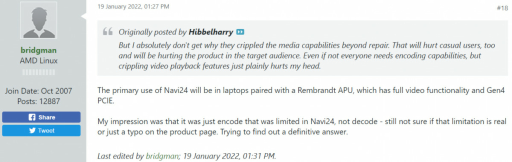A közösség haragját azonban azzal sikerült kihívniuk magukra, hogy a 4GB GDDR6 memóriával felszerelt RX 6500 XT megjelenésekor szó nélkül eltávolították az AMD blogról a 8GB előnyeit taglaló magyarázatot. Sajnos a legkisebb baj az új kártyával a memória mennyisége (esport címekre bőven vállalható), a magas indulóár és az ehhez társuló nyers GPU teljesítmény meglehetősen rossz vétellé alakítja az RX 6500 XT-t. Az sem segített sokat, hogy időközben az AMD egyik munkatársa azt is megerősítette, hogy valóban laptop videókártyának készült eredetileg a Navi24 GPU, ez okolható a további hiányoságaiért. A blogbejegyzést péntek hajnalban visszaállította az AMD, de ez az internet világában már mit sem jelent.