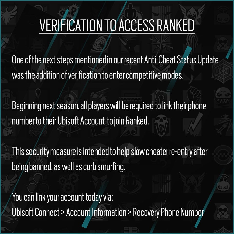 Ahogy a hivatalos bejelentésben is látható, a Ubisoft annak érdekében, hogy további szinten kezelje a játék csalóit, új szabályozást vezet be a játékban. Ezt azt jelenti, hogy a következő évadtól csak olyanok indíthatnak Ranked játékmódot, akik azonosították magukat.