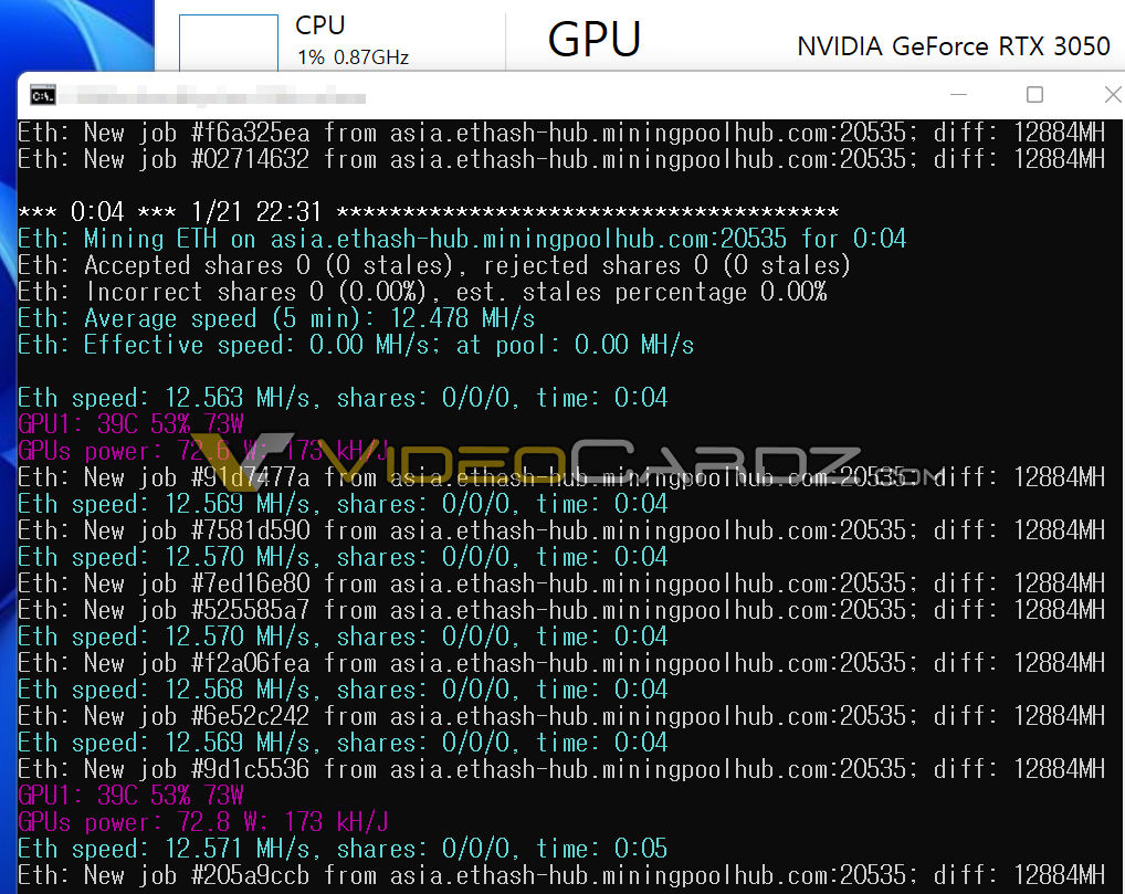 Egy kínai forrásnak köszönhetően némi belátást nyerhettünk Ethereum-bányászati teljesítményére a hamarosan megjelenő RTX 3050-es videókártyán. Úgy tűnik, hogy a kártyát a Lite Hash Rate algoritmussal szállítják, mert a hash rate 20-ról 12,5 MH/s-ra esik le néhány másodperc alatt. Láthatjuk, hogy ennek a hash-ráta eléréséhez a kártya mindössze 73W-ot fogyaszt.