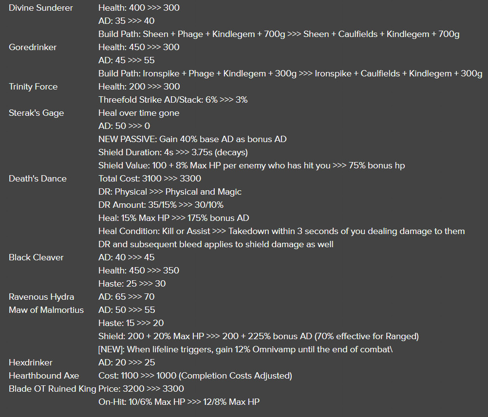 A Goredrinkert és a Divine Sunderert annyiban igazítják ki, hogy a Phage-et mindkét build pathben Caulfield Warhammerrel helyettesítik. A Turbo Chemtank – egy olyan elem, amely azóta volt vizsgálat alatt, amióta a jelenlegi patchben az assassin bajnokok, például Akali buildjeiben alkalmazták – a Refuel passzívjának követelményeit megnövelik, és ennek ellensúlyozására bónusz sebzést adnak a minionokra és szörnyekre.