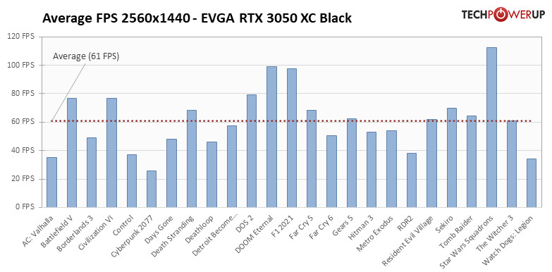 Ezen a felbontáson már több játéknál is szenvedős volt a 60 FPS, ám az átlag így is 61 lett végül. Ne felejtsük el, hogy ezek a játékok maximumra vannak tekerve, így ha kicsit visszaveszünk a részletességből, még 1440p felbontáson sem hagy minket cserben az RTX 3050. A 4K felbontást már nem érdemes átböngészni sem, az átlag FPS 34 környékén alakult.
