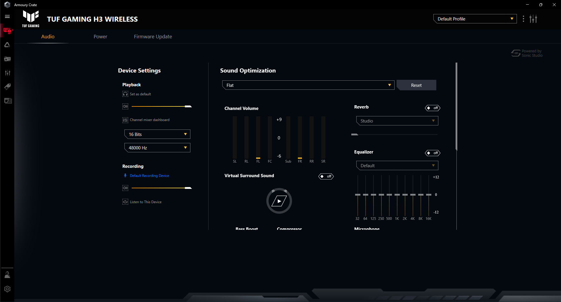 Ezúttal is az Asus ROG Armory Crate áll a rendelkezésünkre, hogy teljesen személyre szabhassuk a frissen vásárolt fejhallgatónkat. Állíthatjuk manuálisan az EQ-t, de az ASUS szolgál nekünk pár előre beállított presettel is. Itt kapcsolhatjuk be a fejhallgató virtuális 7.1 hangzását is és a mikrofonbeállításokat is itt találhatjuk. A H1-hez hasonlóan itt tájékozódhatunk az akkumulátor töltöttségi szintjéről is, ám ezt később a tálcán is megtehetjük a program ikonjára kattintva, nem kell mindig megnyitni a teljes szoftvert. A fejhallgató bedugását követően egy felugró ablak el is lát minket egy linkkel a szoftverhez, ezért ismét csak jár a piros pont.