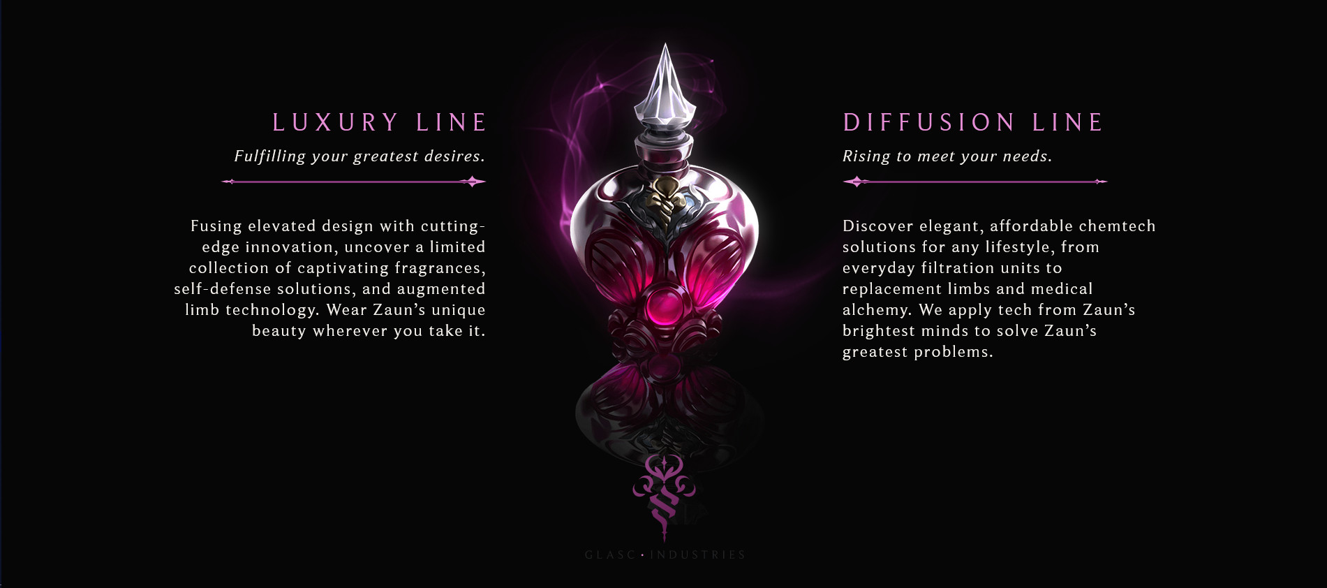 A weboldal egy fiktív runeterrai céget reklámoz, a Glasc Industries-t, amely egy olyan csoport, amely a chemtechet szeretné „megfizethetővé, széppé és mindenki számára elérhetővé” tenni. Az eredetileg Zaunból származó céget egy Renata Glasc nevű alkimista alapította, akinek „látnoki munkája érintette a polgári fejlődést, a technológiát és a filantrópiát”.