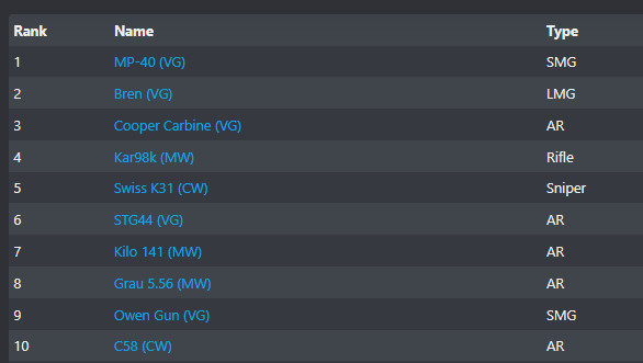 A WZRanked weboldalát figyelgetve világos, hogy a játékosok az új pálya és szezon beköszöntése után két hónappal is még erőteljesen próbálgatják a friss fegyvereket, ám a TOP 5-ben nincs már akkor mozgolódás. Ha a legjob 10 fegyvert nézzük, akkor viszont gyakorlatilag hetente egy új listát készíthetünk az éppen aktuális meta fegyverekről. Decemberben és januárban ezt már megtettük, ám azóta TOP 5-ön belül is cserélődtek a különböző AR-ek és SMG-k, volt ami teljesen eltűnt a süllyesztőbe, míg más a 20. helyről meg sem állt a dobogóig február első hetéig.