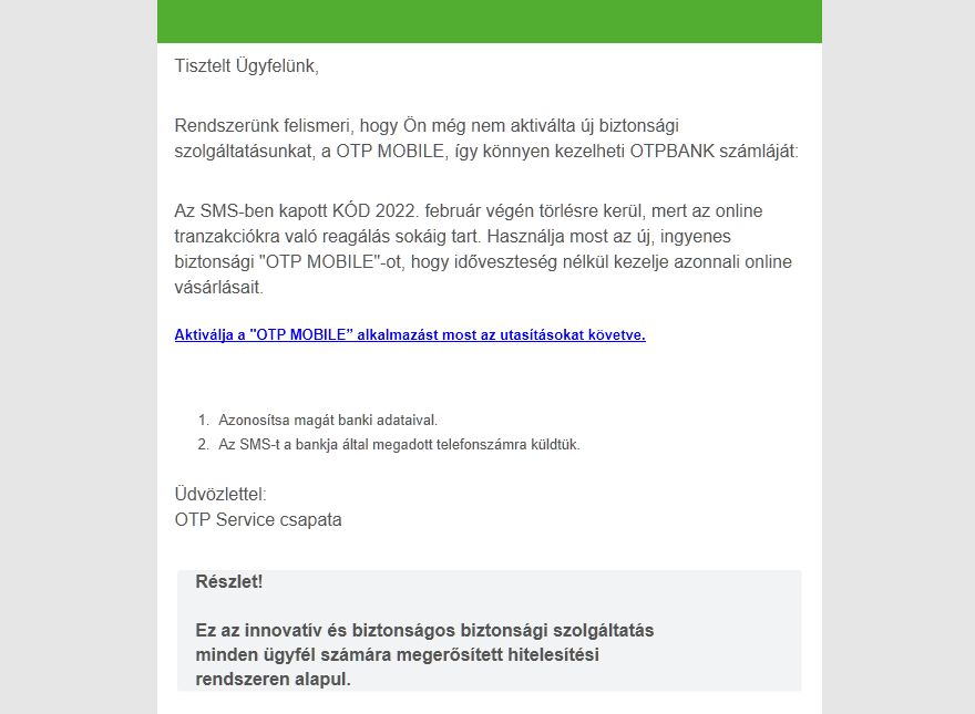 Fontos, hogy az e-mail a bank színét tartalmazza csak, a logót nem -írja a PCFórum. A levélben arra kérik az áldozatokat, hogy aktiválják OTP MOBILE szolgáltatásunkat, mert ha nem, abból baj lesz. A szöveg persze elég bénának tűnik, de még így is sokan kattinthatnak a linkre. Ez a link azonban természetesen egy adathalász oldalra visz, ahol semmilyen adatot nem szabad megadni. Ez nem az OTP oldala, csak egy kamu oldal, ahol lenyúlják a banki adatainkat.